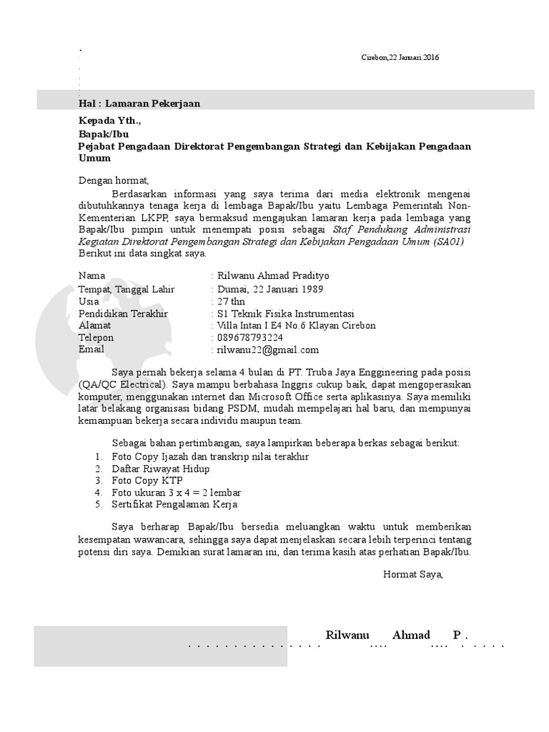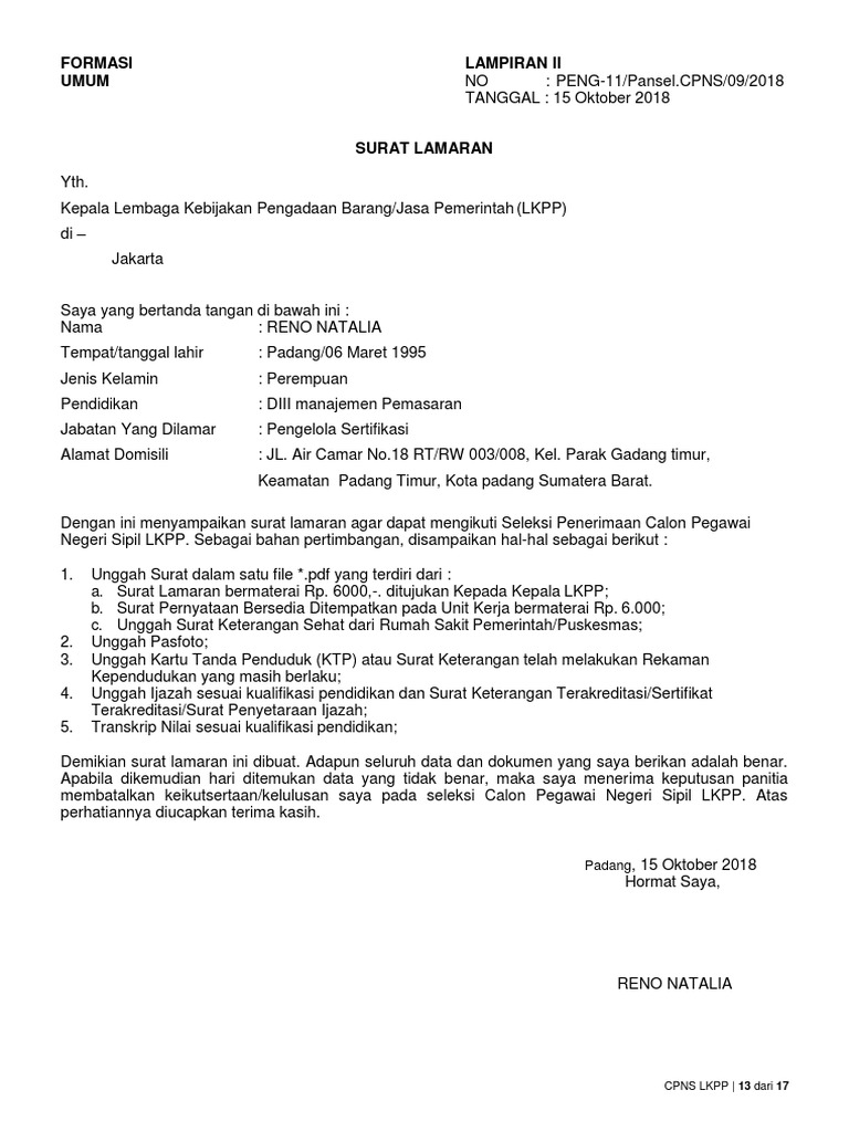 Dengan ini menyampaikan surat lamaran agar dapat mengikuti seleksi penerimaan calon pegawai negeri sipil lkpp. Demikian surat lamaran ini dibuat. Lamaran pekerjaan kepada yth., bapak/ibu pejabat pengadaan direktorat pengembangan strategi dan kebijakan pengadaan demikian surat lamaran ini, dan terima kasih atas perhatian bapak/ibu. Membuat surat lamaran cpns bagi yang belum pernah memang sedikit susah. Surat lamaran merupakan surat permohonan yang dibuat oleh para pelamar pekerjaan atau pencari kerja, kemudian dikirimkan terhadap suatu badan usaha maupun instansi untuk mendapat pekerjaan.